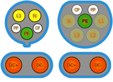 In de afbeelding zien we de CP en PP in de Amerikaanse Type 1 (links) en Europese Type 2 Mennekes stekker (rechts), beiden gecombineerd met de DC-laadstekker. We concentreren ons op de rechter stekker met de CP, PP, de drie fasen (L1 t/m L3) met nuldraad (N) en de zgn. Protective Earth (PE).