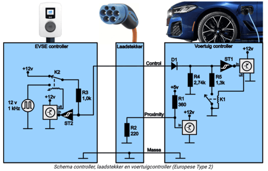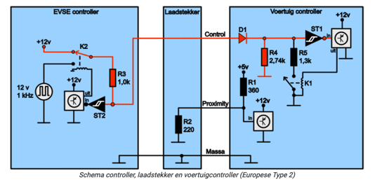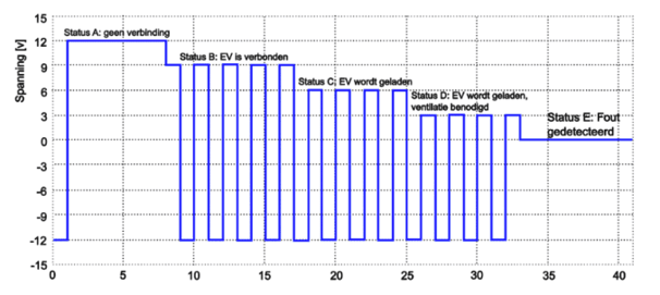 - Na het aansluiten van de laadkabel op het laadstation, zet de EVSE- controller een spanning van 12 volt op de Control Pilot aansluiting van de laadstekker.