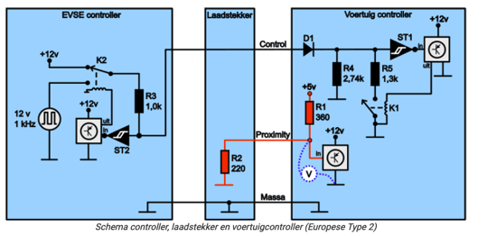 De proximity pilot heeft twee functies: registreren of er een laadkabel is aangesloten en het registeren welk type laadkabel er is aangesloten, zodat de maximale laadstroom kan worden bepaald.