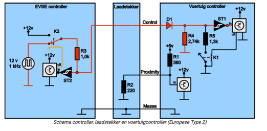 - Status B: Elektrisch Voertuig is verbonden. Relais K2 wordt bekrachtigd. De spanning daalt naar 9 volt als gevolg van de diode in het circuit;
