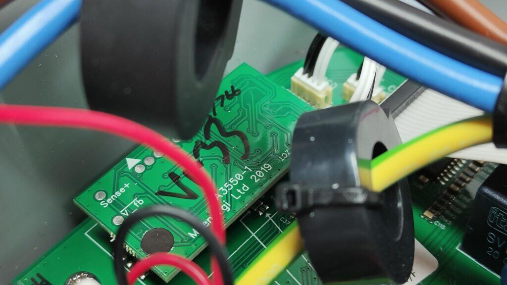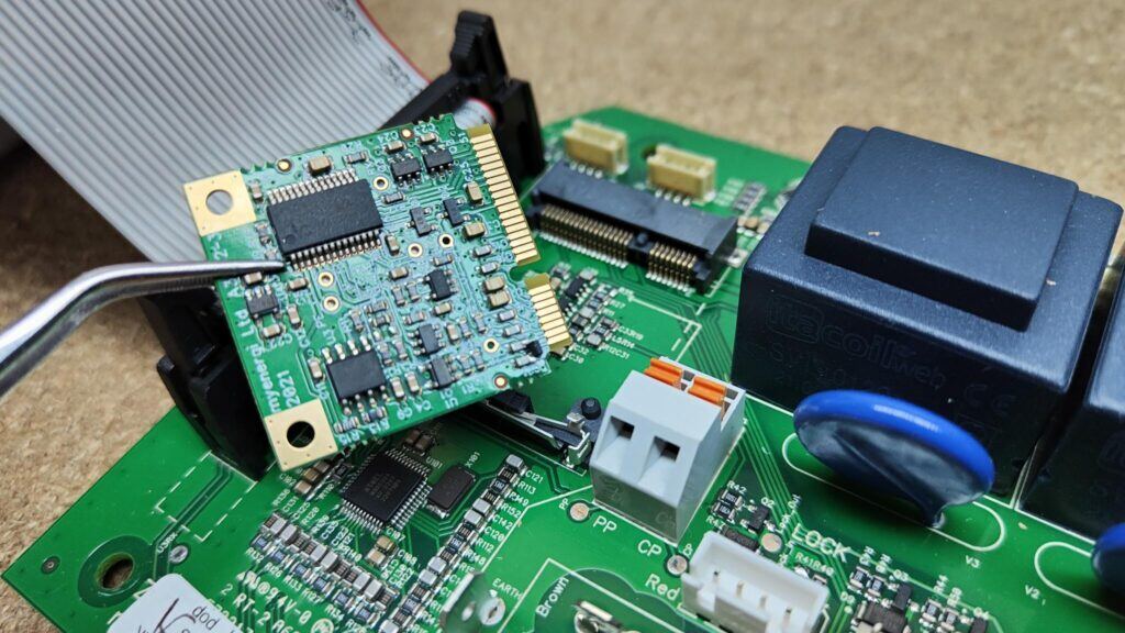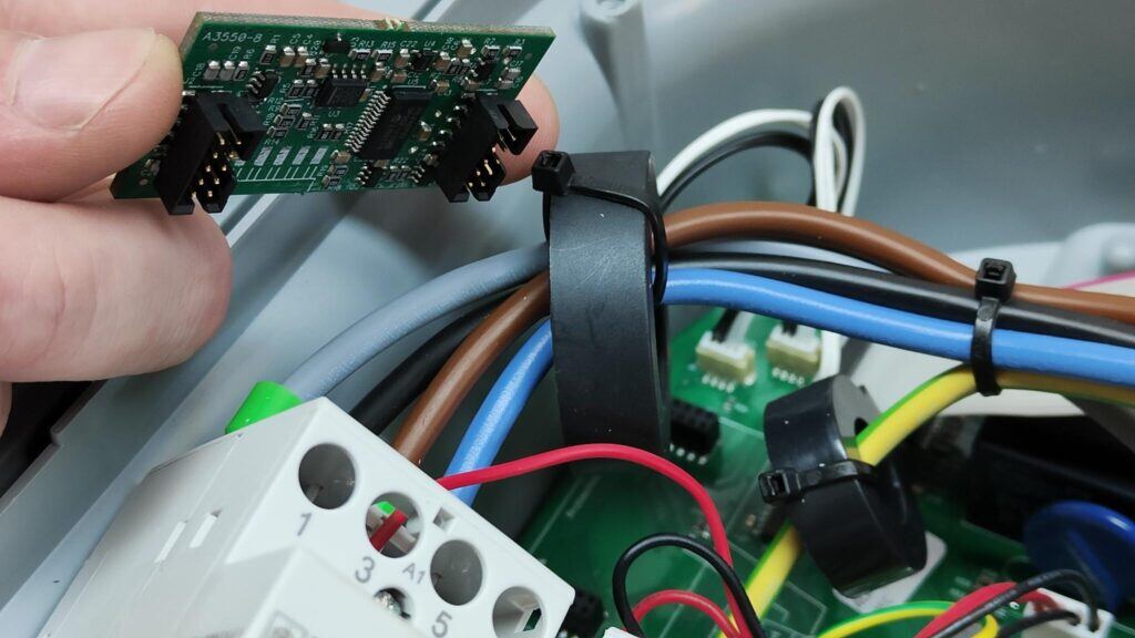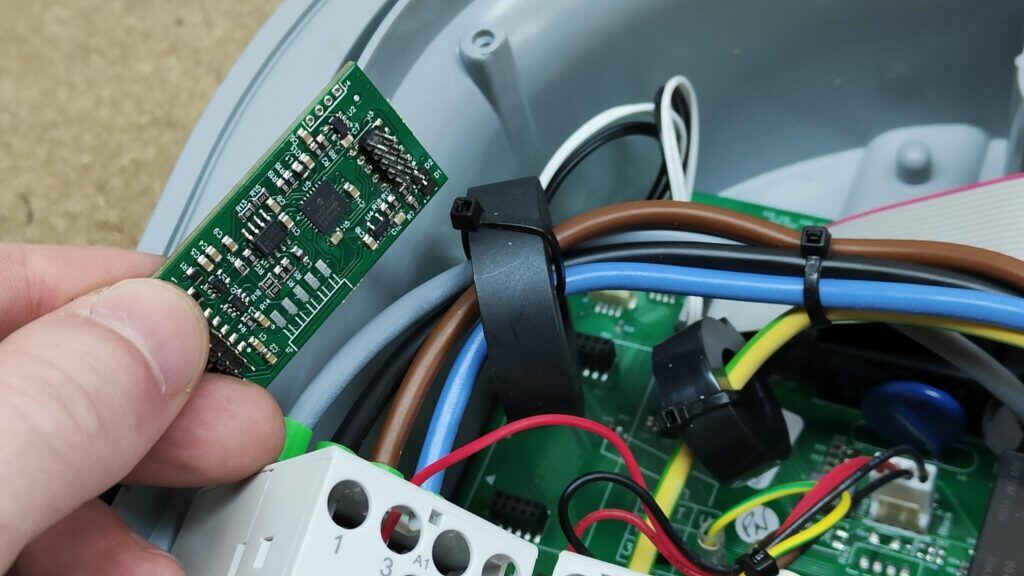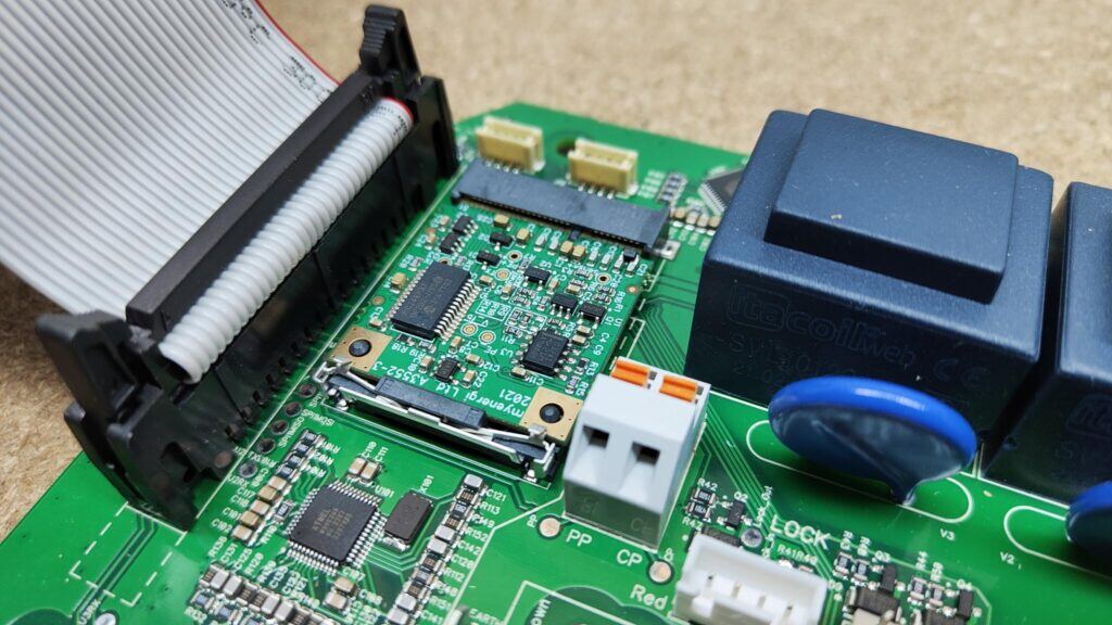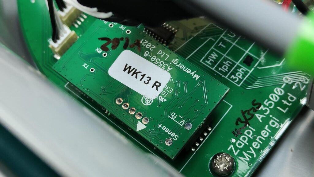 La carte RCD se trouve à l'arrière gauche du Zappi, sous les câbles qui vont du relais blanc à la carte mère. Pour retirer le RCD, il faut d'abord détacher le relais blanc du bas et le soulever.