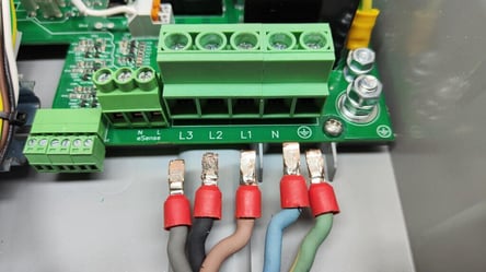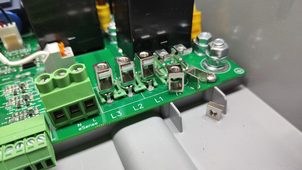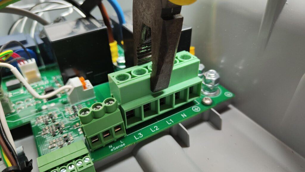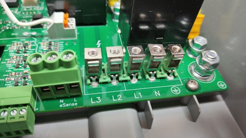 Het terminal block is het onderdeel rechts vooraan in de Zappi waar de connecties van de stroomkabel worden bevestigd: L3 (Grijs) L2 (Zwart) L1 (Bruin) Neutral (Blauw) Aarde (Groen/Geel). Een monofase Zappi heeft een kleiner terminal block met maar 3 aansluitingen, namelijk: L1, Neutral en Aarde.