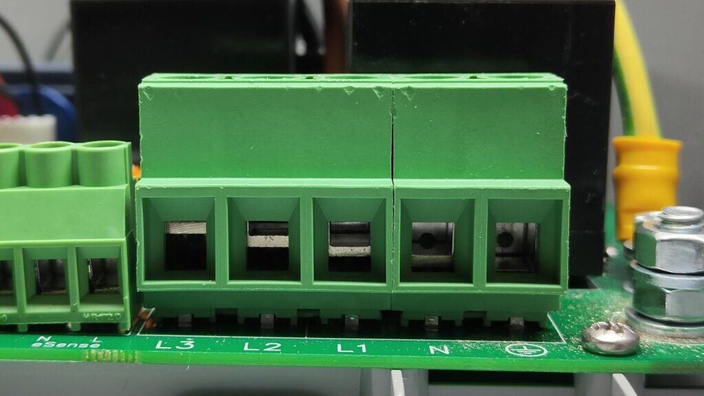 Er zijn voornamelijk 2 situaties waarin het terminal block vervangen moet worden. De eerste is simpel: Terminal block is verbrand. Meestal komt dit doordat een verkeerde aansluiting is aangesloten (Bijvoorbeeld de L1 in de Neutral poort) waardoor kortsluiting kan ontstaan en het plastic van het block kan verbranden.
