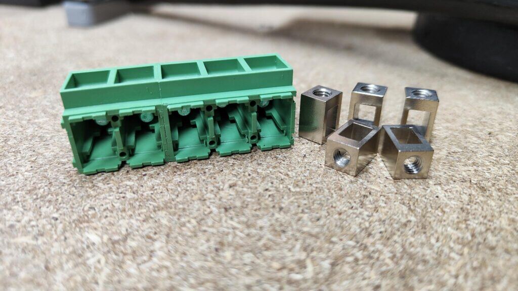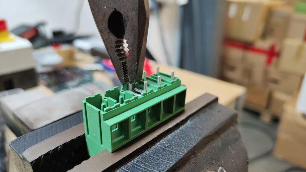 Als het plastic block er af is gehaald blijven de metalen elementen en de kleine metalen blokjes over. Pak een nieuw terminal block, zet deze ondersteboven vast in de bankschroef en trek met de grijptang aan de kleine metalen pootjes. Let goed op, want als ze los komen kunnen de metalen blokjes die meekomen los schieten en op de grond vallen. Als er een metalen blokje kapot was gegaan in het oude terminal block kan dit worden vervangen door een van de nieuwe, of men kan alle blokjes vervangen door de 5 nieuwe.