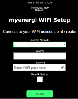 After entering the password, you should automatically be redirected to the myenergi WiFi Setup page. If this page doesn't appear automatically, enter the following address in your web browser: http://192.168.4.1.